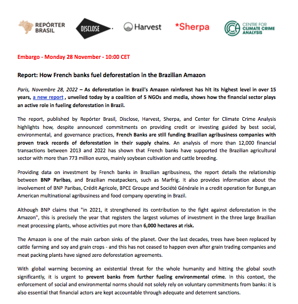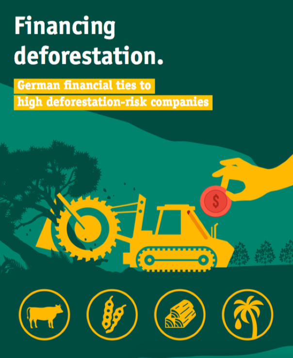 News Report: Legal liabilities of agricultural traders in the soy supply chain under Brazilian law Report: Bankrolling ecosystem destruction. The EU must stop cash flows to businesses destroying nature. Complaint filed against French banks for laundering proceeds of illegal deforestation Press release: Legal liability of French banks financing deforestation in Brazil Report: German financial ties to high deforestation-risk companies Report: State of The Soy Industry